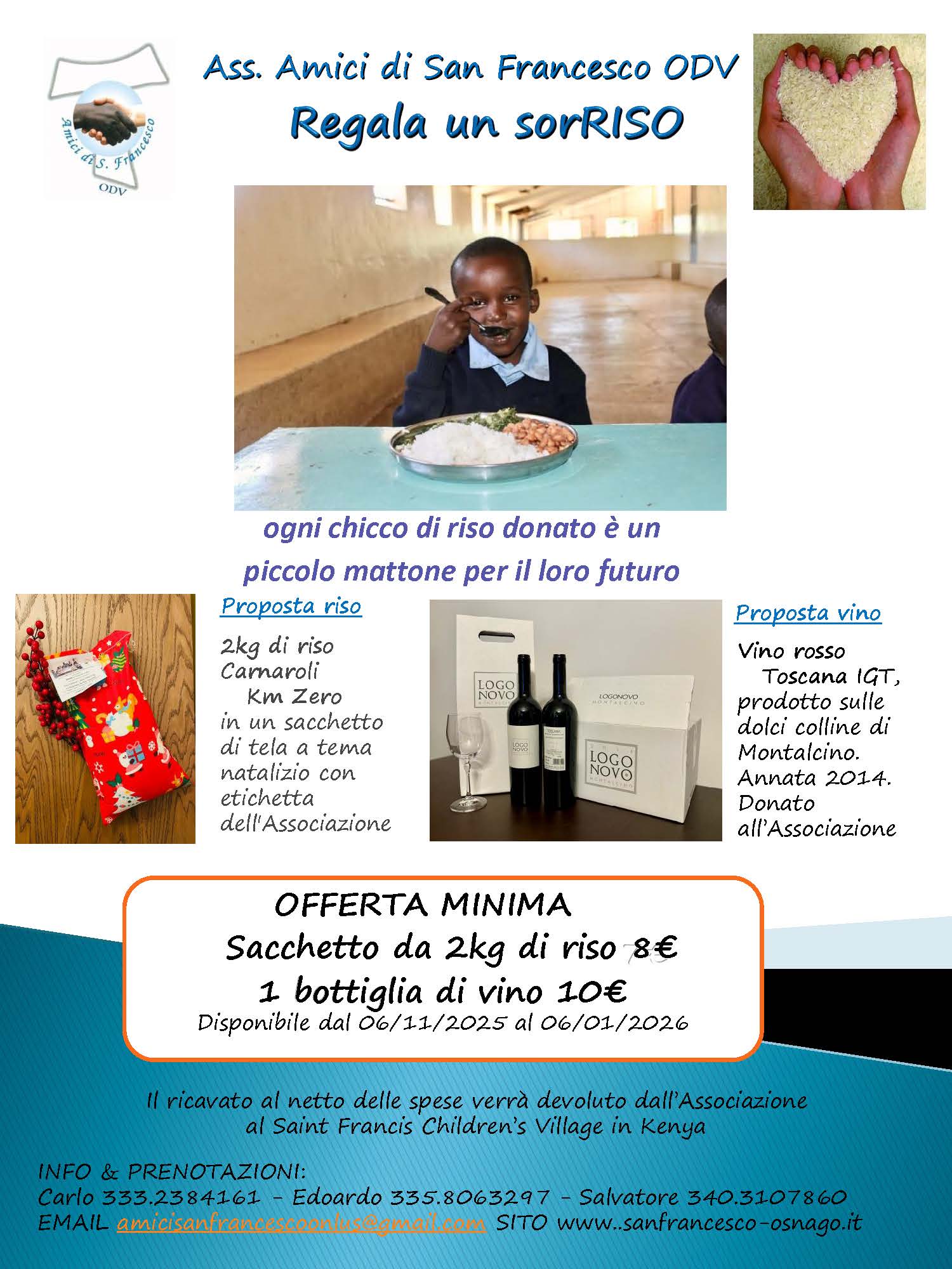 Come gli anni scorsi, sono disponibili sacchetti da 2Kg di RISO CARNAROLI di qualità e le donazioni saranno devolute al St. Francis Children’s Village.