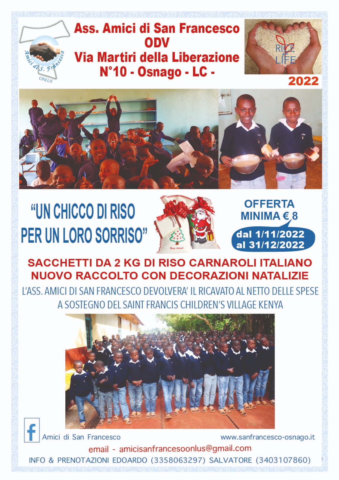 Come gli anni scorsi, sono disponibili sacchetti da 2Kg di RISO CARNAROLI di qualità e le donazioni saranno devolute al St. Francis Children’s Village.